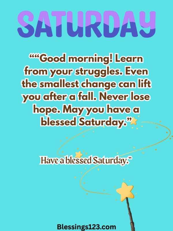 “Good morning! Learn from your struggles. Even the smallest change can lift you after a fall. Never lose hope. May you have a blessed Saturday.”