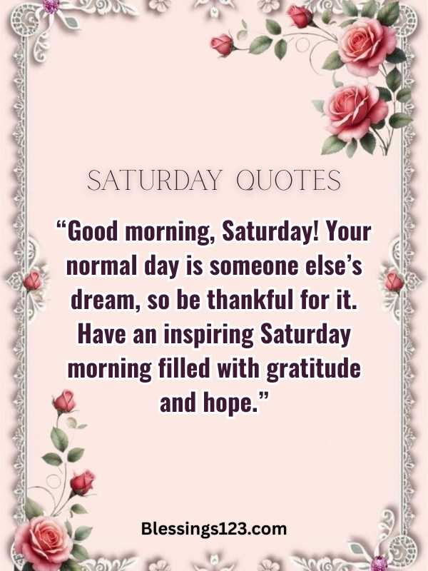 “Good morning, Saturday! Your normal day is someone else’s dream, so be thankful for it. Have an inspiring Saturday morning filled with gratitude and hope.”